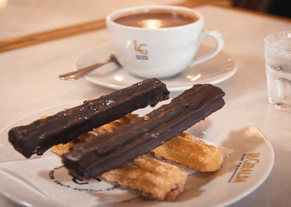 Entre en calor con una humeante taza de chocolate caliente y crujientes churros en La Giralda, una cafetería muy apreciada de Buenos Aires.